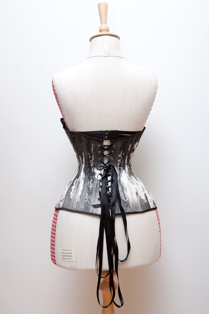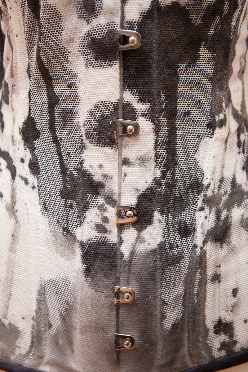 I suppose one of the main reasons that I’m so pleased with this piece is the rawness that the ink has brought to it. So often, lingerie is completely focused on precision and perfection. Although this corset still carries those elements (after all, this many seams need 1mm accuracy in stitching), the act of painting and ‘ruining’ the original garment was a welcome break from the traditional prettiness of underwear and corsetry. This is definitely an aesthetic that I wish to explore more in future: deliberate acts of vandalism towards garments that have already eaten so many hours of precise construction.