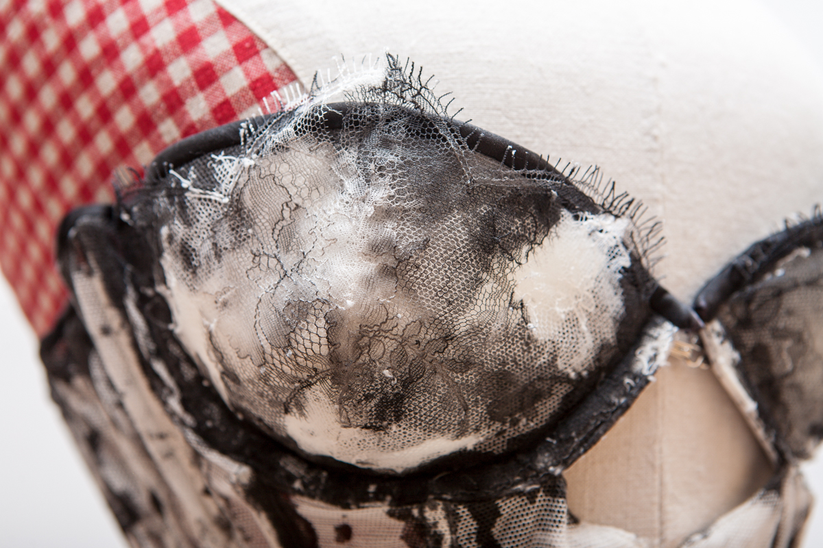 Initially this corset was an experiment with patterning and techniques, so I didn’t have a concrete plan on how I wanted to embellish the piece. Originally I had thought of delicate French lace appliqué in bold black and white, in a mix of symmetrical and assymetrical placement. I cut an outer of scalloped lace for the cups on the assumption that this would be the corset’s final aesthetic, before my plans went dramatically awry…